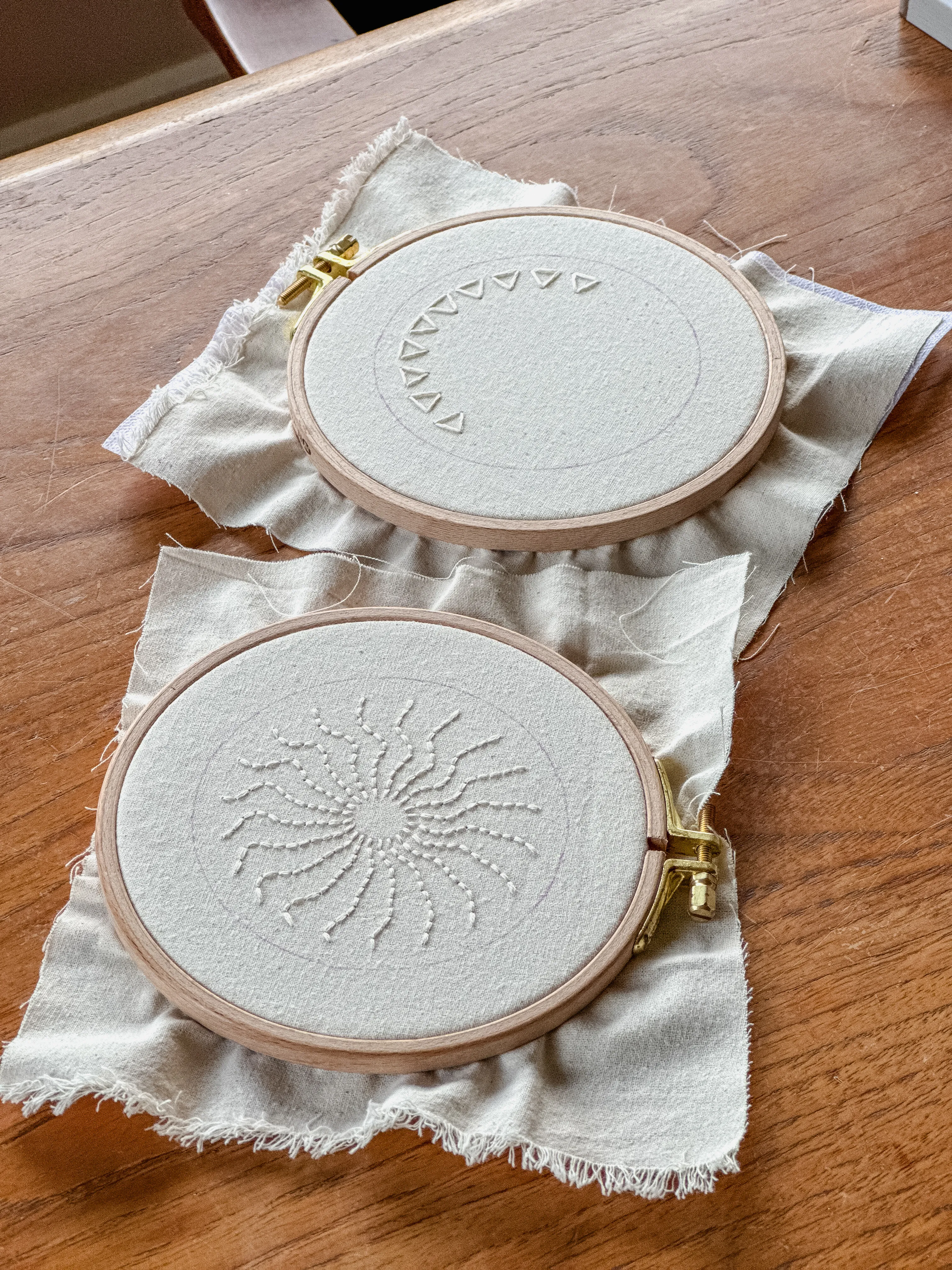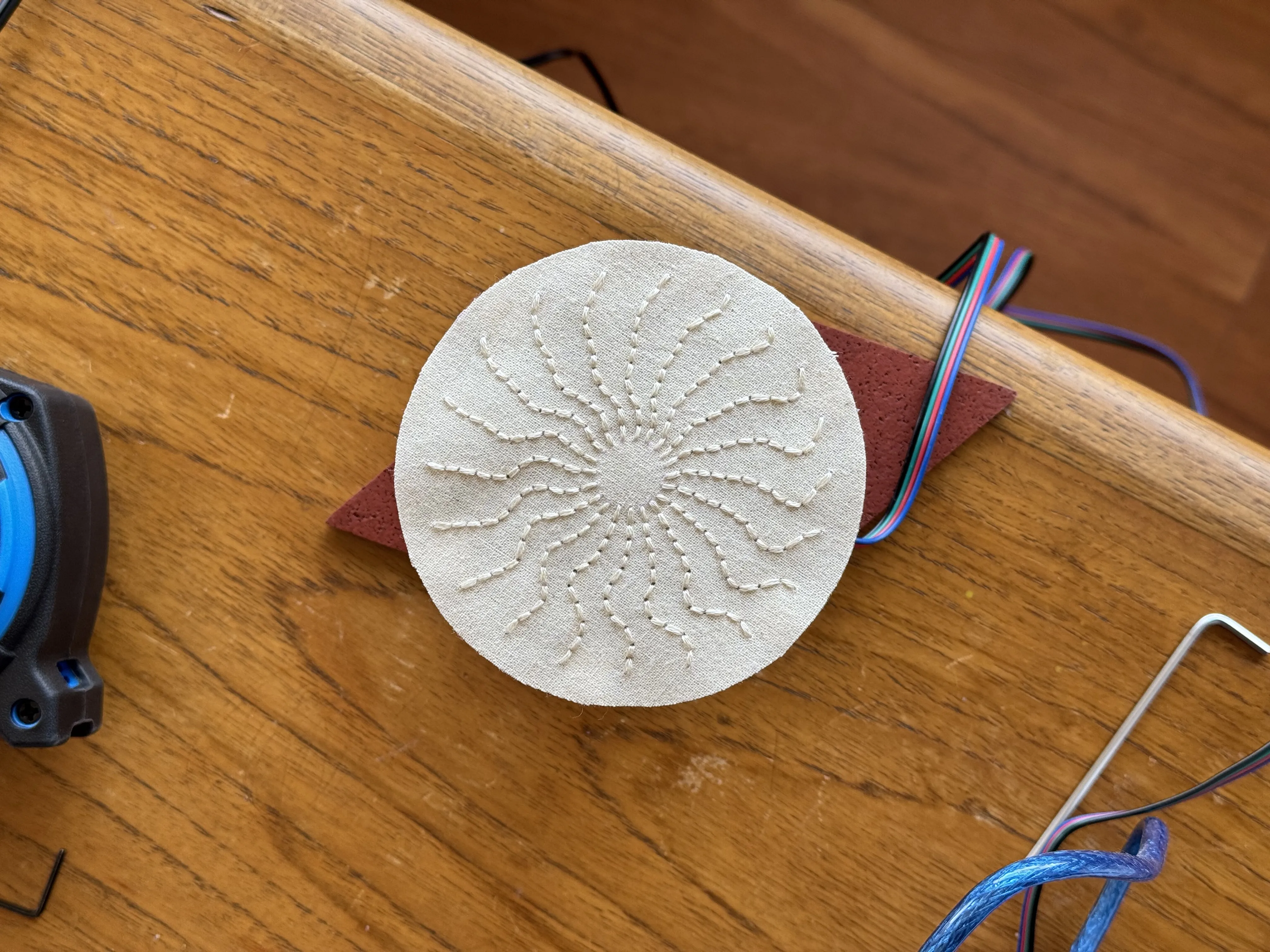 After calibrating the motor with some paper prototypes, I hand embroidered some designs and affixed them to a wooden coaster. It allowed me to finally test the whole rig with the correct weight and materials.